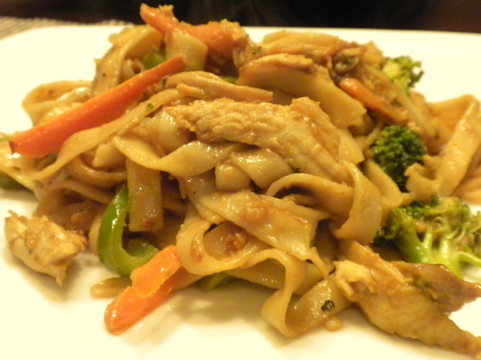 When noodles are done, drain then stir fry in pan with vegetable oil until a little browned. Add vegetables, chicken and sauce. Heat through and let all the flavors mix together.